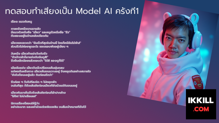 ทดสอบสร้างเสียงเป็น AI ครั้งที่1 ลองแบบไวไวยังไม่ได้เทรนด์ เรื่อง: แมวกับหนู กาลครั้งหนึ่งนานมาแล้วมีแมวตัวหนึ่งชื่อ “เมี้ยว” และหนูตัวหนึ่งชื่อ “จิ๋ว”ทั้งสองอยู่ในบ้านหลังเดียวกัน เมี้ยวชอบอวดว่า “ฉันเร็วที่สุดในบ้านนี้ ใครก็หนีฉันไม่พ้น!”ส่วนจิ๋วไม่ค่อยพูดอะไร ชอบแอบฟังอยู่เงียบ ๆ วันหนึ่ง เมี้ยวท้าแข่งวิ่งกับจิ๋ว“ถ้าเจ้ากล้าก็มาแข่งกับฉันดูสิ!”จิ๋วยิ้มเล็กน้อยแล้วตอบว่า “ได้สิ ลองดูก็ได้” เมื่อเริ่มแข่ง เมี้ยววิ่งเร็วปรื๋อจนเห็นฝุ่นตลบแต่พอถึงครึ่งทาง เมี้ยวเห็นขนมวางอยู่ จึงหยุดกินอย่างสบายใจ“ยังไงก็ชนะอยู่แล้ว กินก่อนดีกว่า” จิ๋วค่อย ๆ วิ่งไปทีละนิด ๆ ไม่หยุดพักจนในที่สุด ก็ถึงเส้นชัยก่อนเมี้ยวที่ยังมัวแต่กินขนมอยู่ เมี้ยวหันมาเห็นจิ๋วถึงเส้นชัยก่อนก็อ้าปากค้าง“โอ้โห! ไม่น่าเชื่อเลย!” นิทานเรื่องนี้สอนให้รู้ว่า:อย่าประมาท และอย่ามัวแต่เพลิดเพลิน จนลืมเป้าหมายที่ตั้งไว้